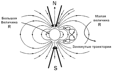 Частицы с малой жёсткостью будет отражаться от магнитной брони нашей Земли, частицы с большой жёсткостью будут проникать внутрь поля, и они либо погибнут в атмосфере, либо уйдут вновь в космическое пространство. А для некоторой доли частиц – с промежуточными величинами жёсткости магнитное поле представляет собой ловушку – частицы окажутся захваченными в нём (см.рис. 13.5).